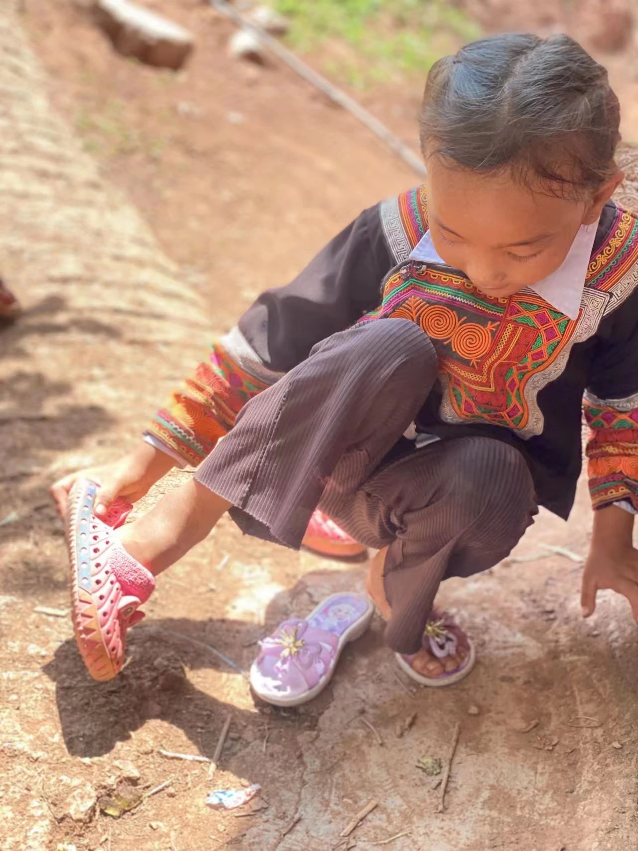 女孩们换上我们捐赠的白纱裙,带上粉色爱心的小皮筋儿,显得有些拘谨,裹着泥土的小手不敢去触摸喜爱的裙子。孩子们得到了新衣服、新鞋子、新书包,用麻袋扛,用竹筐背,肩上还有年幼的弟弟,爬过一座高山带回家。