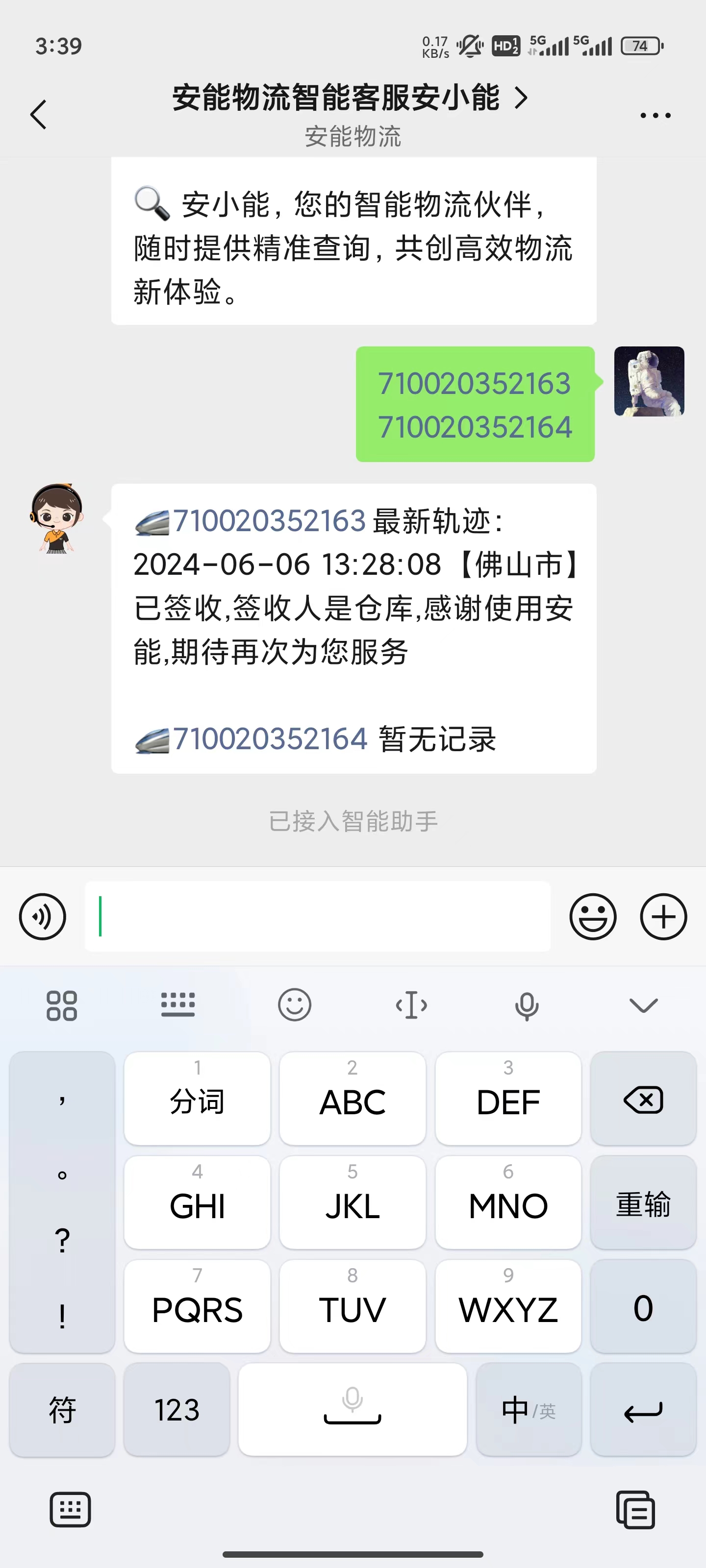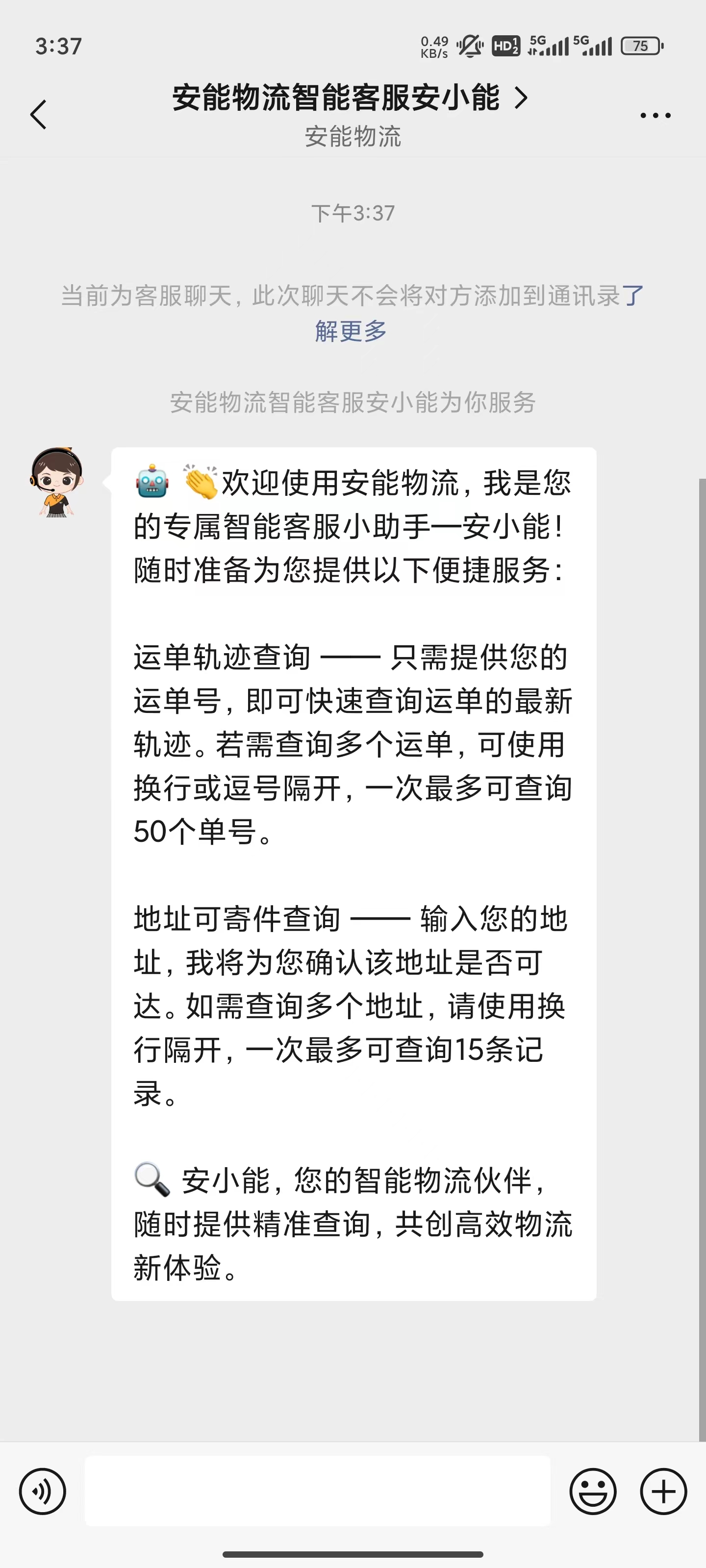在和小能的对话框中,输入12位安能单号,即可获取物流详情哦!