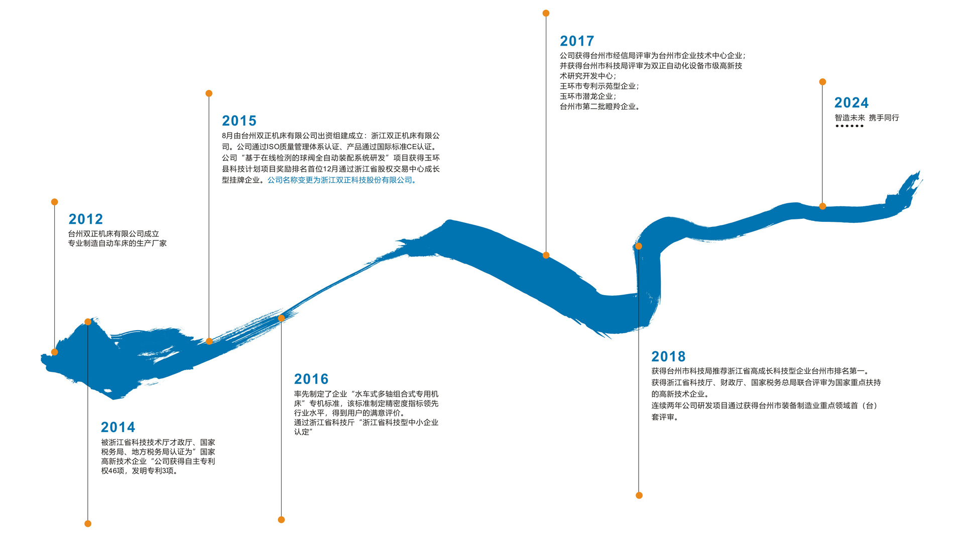 2015年公司“基于在线检测的球阀全自动装配系统研发”项目获得玉环市科技计划项目奖励排名首位,2015年12月通过浙江省股权交易中心成长型挂牌企业。2016年91天媒传媒mv在线视频率先制定了企业“水车式多轴组合式专用机床”专机标准,该标准制定精密度指标领先行业水平,得到用户的满意评价。2016、2017连续两年公司研发项目通过获得台州市装备制造业重点领域首(台)套评审。2016年通过浙江省科技厅“浙江省科技型中小企业认定”,2017年91天媒传媒mv在线视频获得台州市科技局推荐浙江省高成长科技型企业台州市排名第一。2017年91天媒传媒mv在线视频获得浙江省科技厅、财政厅、国家税务总局联合评审为国家重点扶持的高新技术企业。2018年公司获得台州市经信局评审为台州市企业技术中心企业;并获得台州市科技后评审为双正自动化设备市级高新技术研究开发中心,玉环市专利示范型企业等,台州市第二批瞪羚企业等。